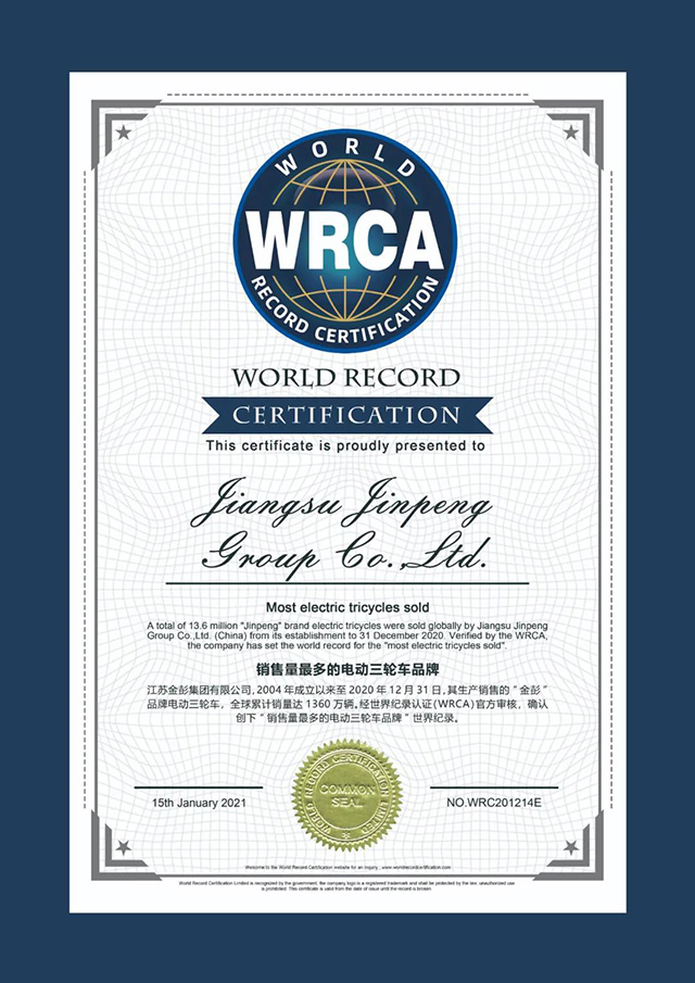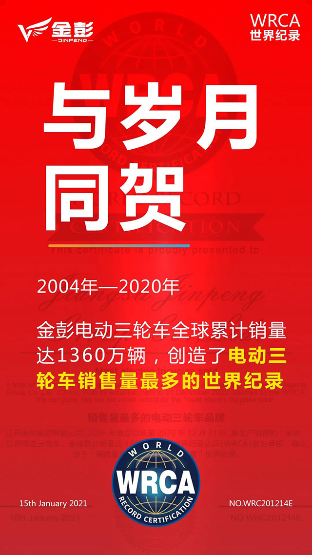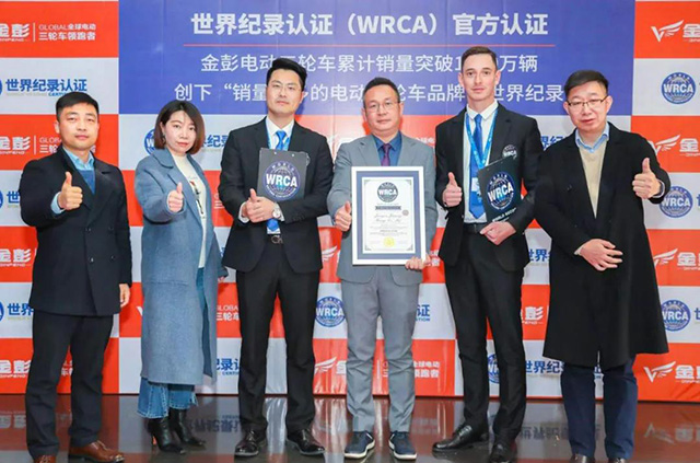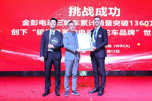 2020年底,金彭以“累計電動三輪車銷量1360萬輛”正式向WRCA申請挑戰“銷售量最多的電動三輪車品牌”世界紀錄,經過WRCA官方的嚴苛審查和反復論證,最終認定金彭挑戰成功,并將其記入世界紀錄大全史冊,金彭的“世界之最”終于得到了國際權威機構的認可。