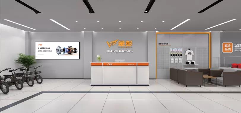 采用分級式門頭展現:1級門頭是醒目的Logo,能夠讓用戶直觀地認知到金彭的品牌;2級門頭“用科技創造美好出行”傳遞金彭長久以來堅持的面向用戶的企業使命;3級門頭“經營品類”提供更明了的銷售品類信息。同時整體采用通透的櫥窗設計,可以一覽店內空間。