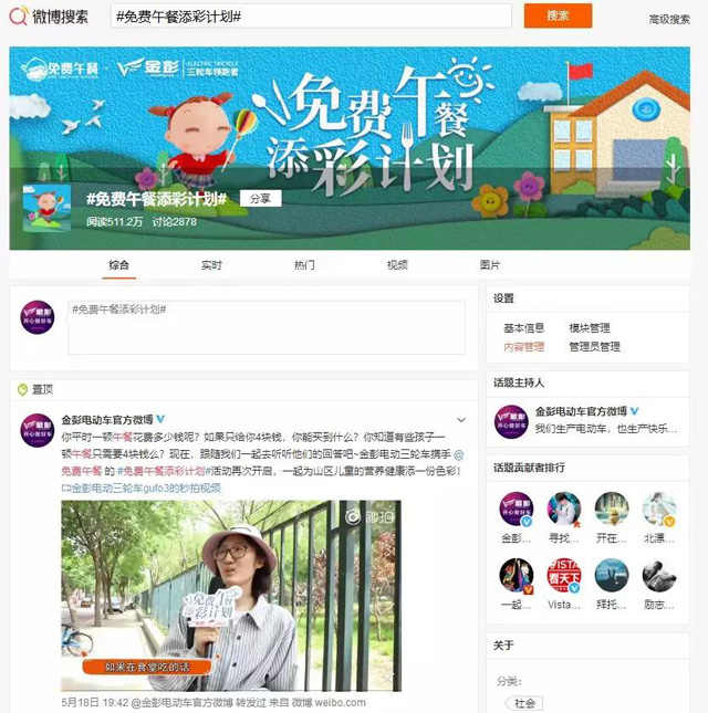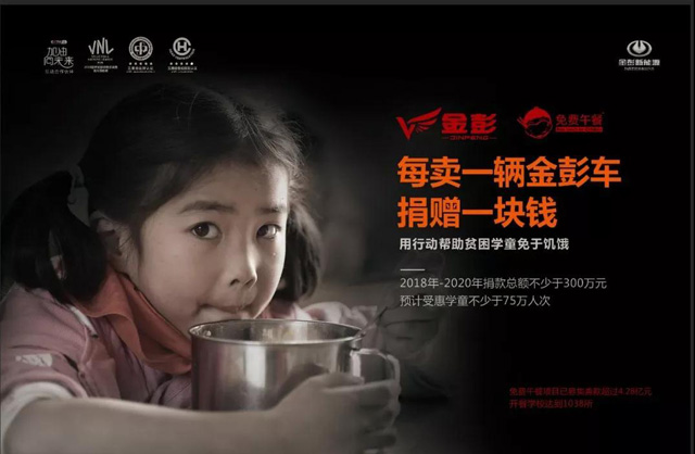 2018年,金彭與免費午餐基金共同發起,策劃了以“添彩計劃”為主題的專屬公益活動,以愛之名,為愛添彩。